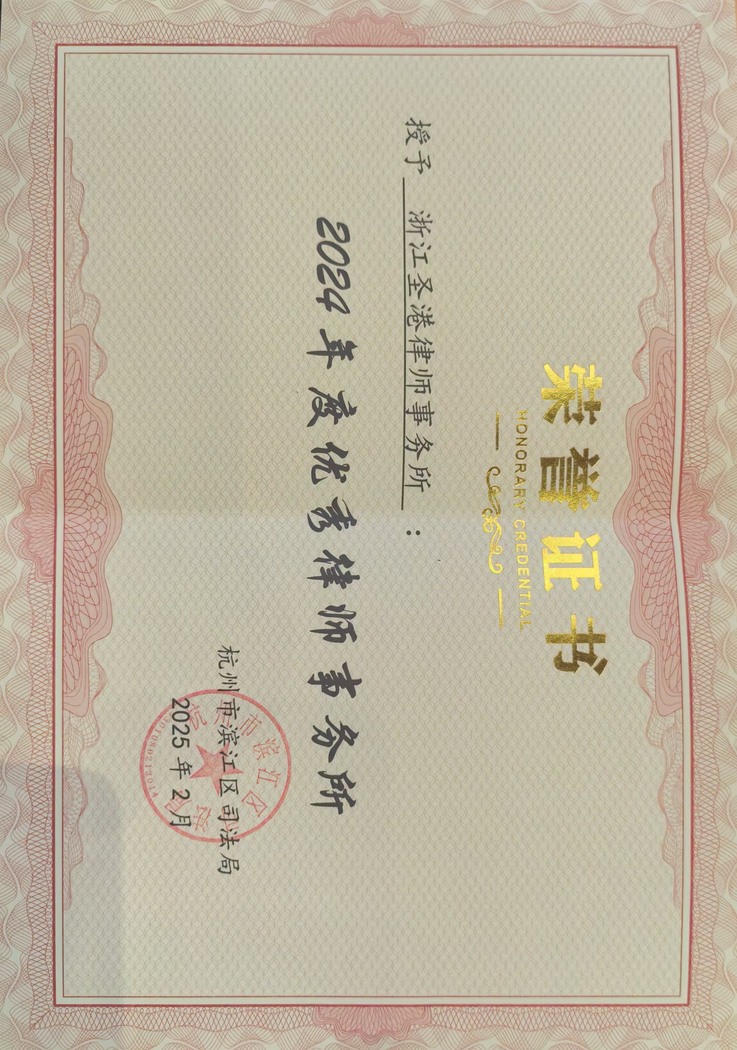 2024年,我所深入贯彻习近平法治思想,积极履行社会责任,在维护社会公平正义、促进社会经济发展、推进法治建设等方面发挥了重要作用,被杭州市滨江区司法局评为2024年度优秀律师事务所。在新的一年,我所及全所律师将珍惜荣誉,再接再厉,充分发挥模范带头作用,为推动我区律师行业高质量发展做出更大贡献。
